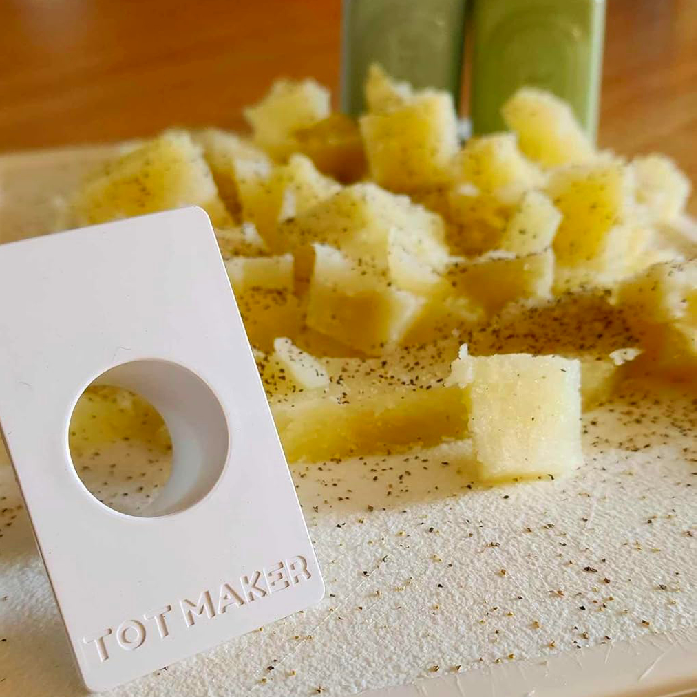 - Press with Tot Maker: Place potato chunks in the Tot Maker mold. Press firmly to form uniform tots.